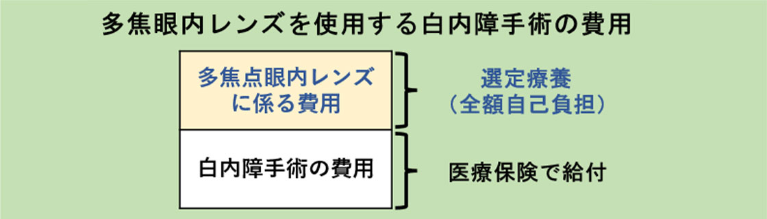 選定療養とは、患者さんご自身が選択して受ける追加的な医療サービスで、その分の費用は全額自己負担となります。令和4年より、術後の眼鏡使用の軽減を目的とした多焦点眼内レンズを使用する白内障手術は、厚生労働省が定める選定療養の対象となりました。